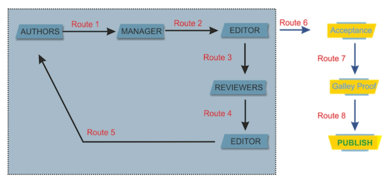 - Notification of Manuscript Acceptance, Revision, or Rejection (by editor to author based on reviewers comments) (route 5)
